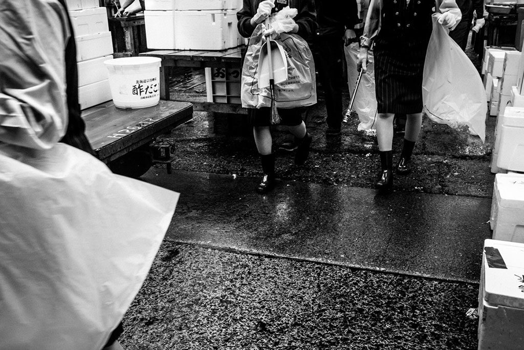 The night is now coming to a close. So is all selling activity. The market gradually empties out. This is when the Tsukiji market salarymen make their appearance: mysterious, compact figures wearing elegant suits, armed with bags, transparent gloves and brooms.
